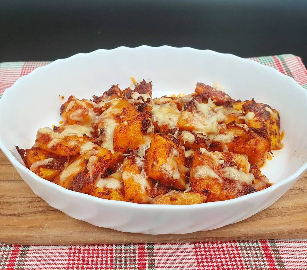 Элементарное в приготовлении, но очень вкусное блюдо. Оно может быть как постным, так и скоромным. Я не очень люблю блюда из тыквы, но это меня покорило)) На фото блюдо из половины ингредиентов. #пост #веган #тыква Ингредиенты: неочищенной тыквы, растительного масла для жарки, чёрного молотого перца, соли, паприки, базилика, томатной пасты, чеснока, сахара, воды по необходимости, моцареллы или твёрдого сыра Способ приготовления: 🔰Тыкву почистить и нарезать кусочками размером 2,5-3 см. 🔰Обжарить тыкву на разогретом растительном масле до румяной зажаристости. 🔰Добавить специи и пропущенный через пресс чеснок. Хорошо перемешать. Блюдо почти готово. Осталось довести тыкву до желаемой мягкости. Это можно сделать на сковороде или в духовке. ⚠️Время дальнейшего приготовления зависит от твёрдости тыквы. Чтобы сохранить форму кусочков тыквы, лучше продолжить приготовление в духовке. 🔰Переложить тыкву в форму, добавить 2 ст л воды. ⚠️Если тыква не плотная, то воду добавлять не надо. 🔰По жел