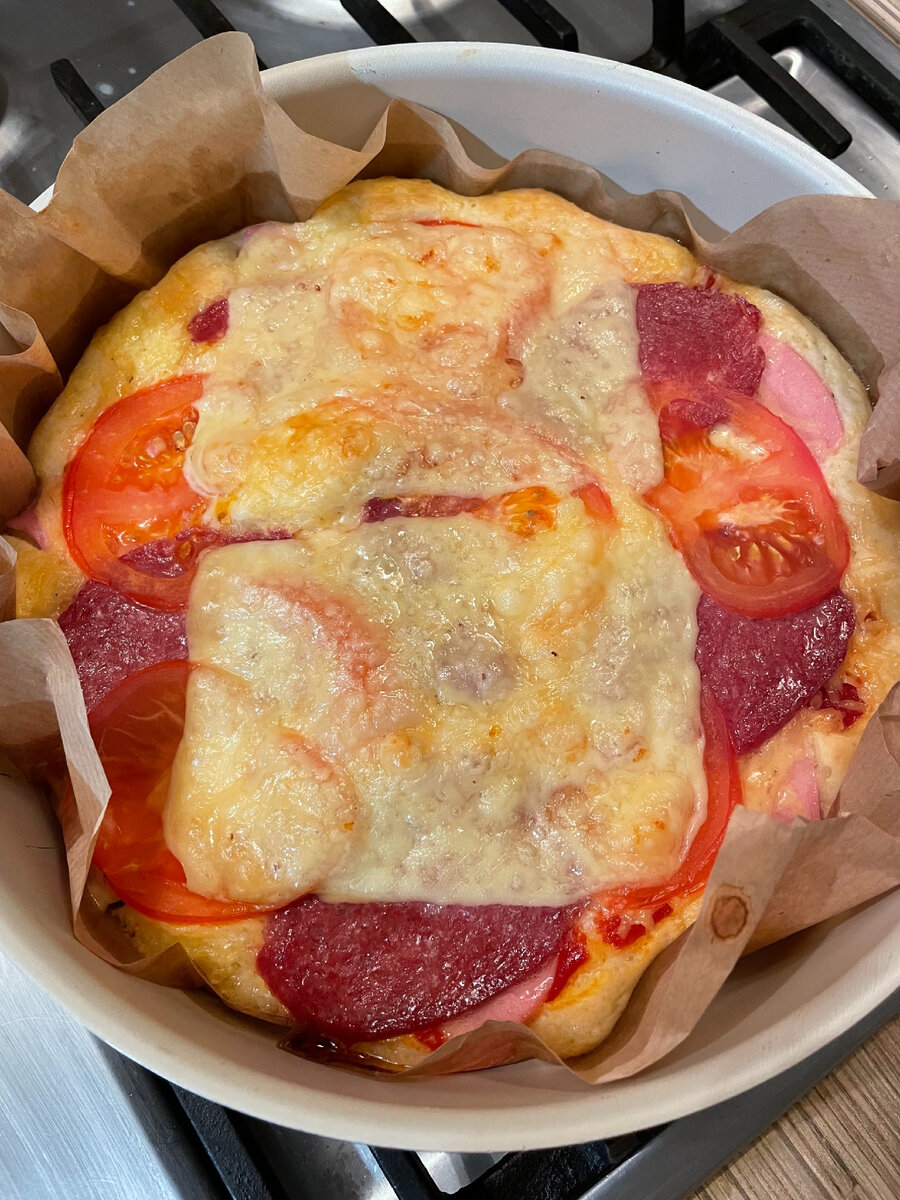 Дорогие друзья, всем привет! Сегодня я делюсь с вами рецептом самой быстрой пиццы, которую я знаю. Это рецепт, который очень выручит вас, когда надо быстро и вкусно приготовить что-нибудь! Для приготовления нам понадобятся следующие ингредиенты: Для теста: Для начинки: Итак, приступим к приготовлению Шаг 1 - приготовление теста. В миске взбиваем яйца, добавляем сметану и майонез, хорошо взбиваем. Добавляем муку и соль, хорошо взбиваем венчиком, чтобы на было комочков. Шаг 2. Форму, в которой будет запекаться пицца, застилаем пергаментной бумагой и выкладываем получившееся тесто. Шаг 3. Тесто немного смазываем кетчупом. Можно заменить на томатную пасту Шаг 4 - приступим к начинке. Начинка может быть абсолютно любой, на ваш вкус. Варёную колбасу нарезаем тонкими полукольцами и выкладываем на тесто Сыр трём на мелкой терке и посыпаем пиццу тонко нарезаем сырокопченую колбасу и выкладываем следующим слоем помидор хорошо моем, нарезаем тонкими кольцами и выкладываем на колбасу