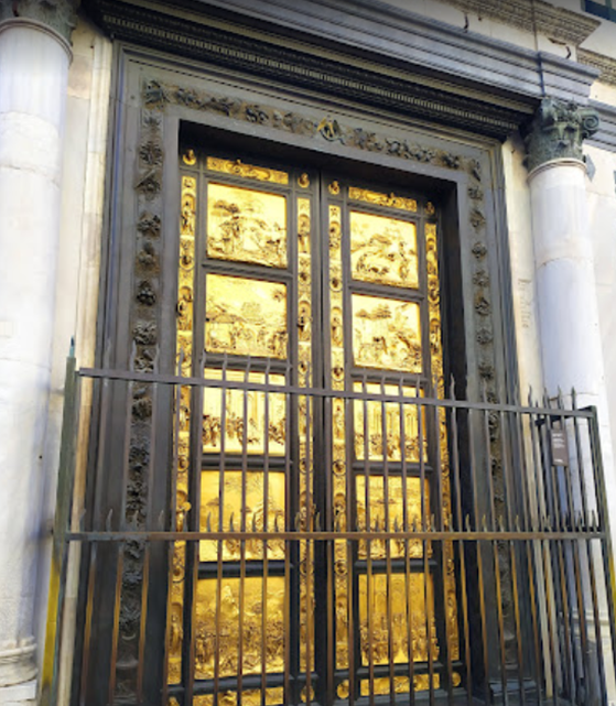 Мы уже рассказывали о куполе флорентийского баптистерия, всегда считавшегося основной достопримечательностью города, и ставший еще более известным после выхода в свет фильма "Инферно". Он построен в классическом, традиционном флорентийском стиле. Сущность классицизма баптистерия заключается, в частности, в мере, в равновесии, в его гармонии. Однако, несмотря на наличие колонн, коринфских капителей, остроконечных окон, его формы не являются строго «классическими». Олной из достопримечательностей баптистерия являются его массивные двери. Три двери, между готикой и ренессансом Баптистерий Флоренции славится своими тремя прекрасными бронзовыми дверями - шедеврами итальянской готической и ренессансной скульптуры. Эта дверь, украшенная позолотой на барельефных фигурах, представляет Истории из Нового Завета , с четырьмя евангелистами и четырьмя Отцами Церкви .