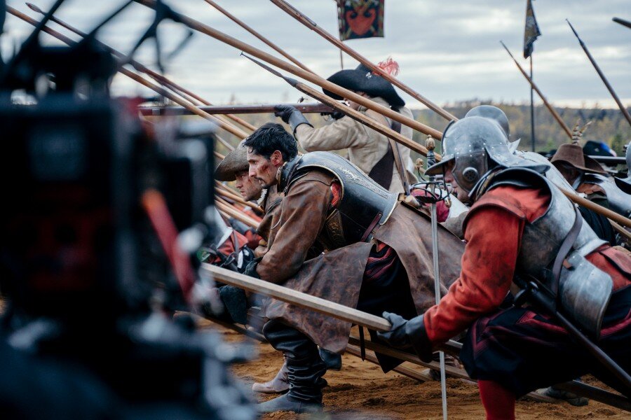 Далее нам представляется эдакая «Последняя Терция» ну или конец фильма «Капитан Аллатристе». Мятежники представлены баталией пехоты: пикинер в кирасах да шлемах и мушкетёры, а точнее – аркебузиры. В свою очередь их противник –рейтары, возглавляемые молодым длинноволосым человеком, к которому почтительно обращаются «Маршал». Главком весь в чёрном, с надменным лицом и маленько похож на Рейнхарда Гейдриха (земля ему стекловатой).