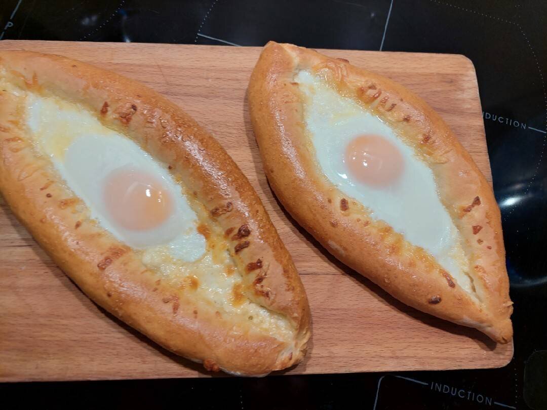 Рецепт довольно простой, получается очень сытное и вкусное блюдо. Ингредиенты: муки, тёплого молока, растительного масла, соли, сахара, сухих дрожжей, Начинка, сыра сулугуни, российского сыра, адыгейского сыра, яйца Способ приготовления: В тёплое молоко всыпать сахар и дрожжи. Дать постоять 10 минут. В Миске смешать дрожжевую смесь, соль, масло и муку. Замесить тесто. Оно будет эластичным, хорошо отлипать от рук. Миску накрыть плёнкой или полотенцем, убрать в тёплое место минут на 40. Готовое тесто выкладываем на рабочую поверхность. Тесто разделить на 4 части. Сыр натереть на крупной тёрке. Раскатываем каждый шар теста в овал. По краям выкладываем немного сыра, и закручиваем, формируя лодочки. В середину выкладываем начинку из сыра, бока смазать яйцом. Выпекать в разогретой до 180 градусов духовке около 15 минут. Через 15 минут достать хачапури и аккуратно добавить яйцо и немного сливочного масла. Выпекаем ещё 2-3 минуты, следим чтоб желток остался жидким! Приятного аппетита!