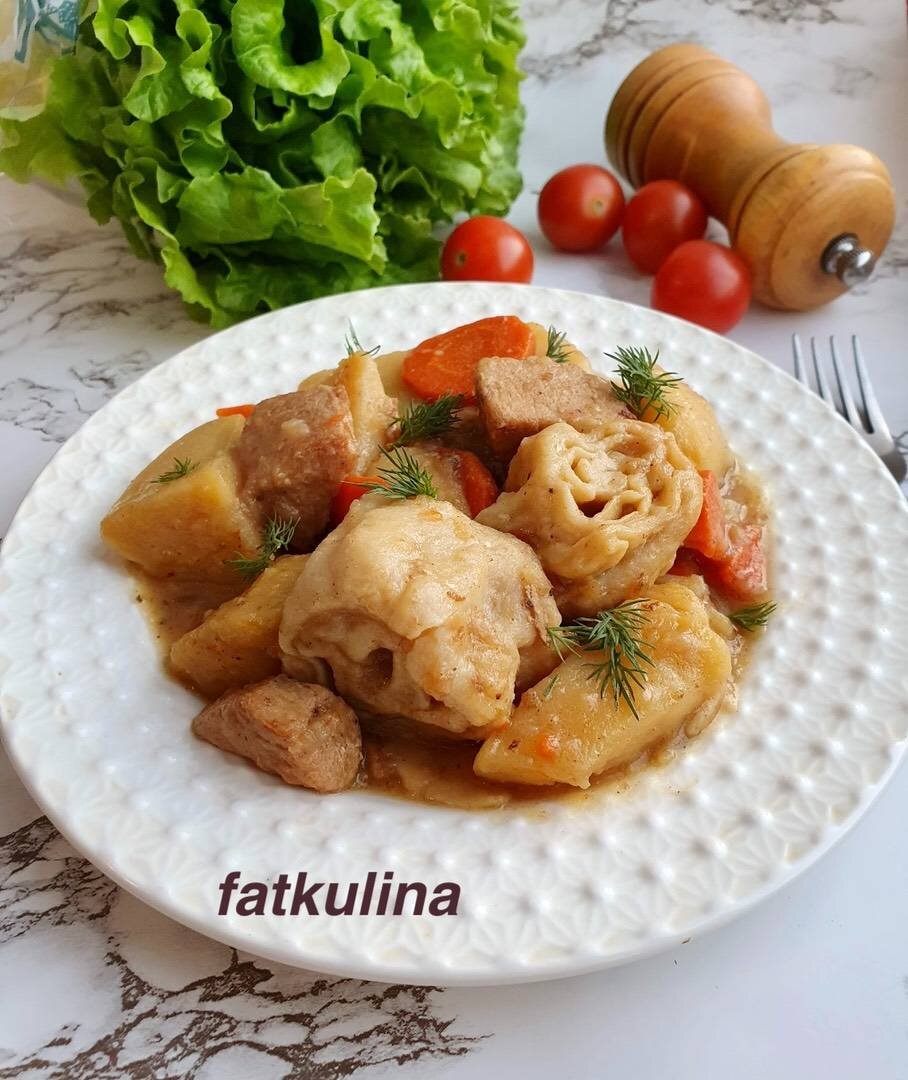 #курица Ингредиенты: курица, растительное масло, лук репчатый, морковь, овощи сушёные "cookpad", картофель, Тесто для штрудлей, яйцо, воды, соли, Мука, луковица, Соль и перец Способ приготовления: Курицу разделить на порционные кусочки. Обжариваем в небольшом количестве масла. Нарезаем лук и морковь произвольно. Добавляем специи или сушеные овощи, картофель. Также обжариваем. Готовим тесто. В миску разбиваем яйцо и вливаем воду, соль щепотку, всыпаем муку, замешиваем тесто. Тесто как на пельмени. Тесто раскатываем в пласт, в отдельной миске соединить измельченную луковицу, соль и черный молотый перец. Лук распределяем по всей поверхности теста. Свернуть в рулет. Разрезаем на шайбочки толщиной 2-3 см. К овощам вливаем воду и выкладываем штрудли. Готовим на среднем огне 30 минут. За 5 минут до готовности кладём лавровый лист. Приятного аппетита!