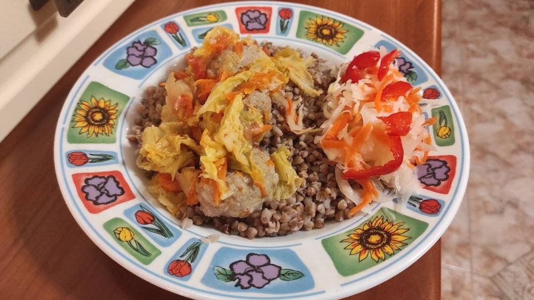 Если описать несколькими словами - это просто, сытно, полезно и очень вкусно. Назвать можно как угодно это блюдо - митболы, фрикадельки и, даже, некий вариант ленивых голубцов. Главное, приправить, пусть самое простое блюдо, любовью) #фрикадельки #митболы #ленивыеголубцы #обед #ужин #такаяистория Ингредиенты: мясного фарша, крупная луковица, крупная морковь, помидор, савойской капусты, растительного масла, букетик гарни, соль, перец, травы Способ приготовления: Из фарша, приправленного солью, перцем, формую небольшие шарики. Укладываю, в один слой, в сотейник. Добавляю немного кипятка и букет гарни. Накрываю крышкой и готовлю на медленном огне. Отдельно в сковороде, на растительном масле, пассерую лук, морковь и помидоры. Всё, предварительно, нарезаю, с помидорчиков снимаю кожицу. Пока, две конфорки варочной поверхности работают, измельчаю небольшой кочан савойской капусты и отправляю к овощам. Смешиваю, приправляю солью, перцем, пряными травами, минут пять тушу. Овощную поджарку выкла