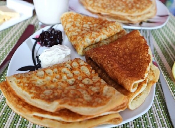 Эти ажурные блинчики на кефире приготовлены по особому рецепту – с добавлением соды и молока. Такое сочетание кажется немного необычным для блинного теста, однако результат превосходит все ожидания. Если вы любите кружевные блинчики с дырочками – вам безусловно стоит попробовать этот рецепт. Благодаря своему «кружевному узору» эти блины не только вызывают аппетит, но и подтверждают свой красивый вид отличным вкусом. Эти блинчики нежные, пышные и просто невероятно вкусные. Тесто для них готовится из смеси кефира с молоком и добавлением пищевой соды, что делает его более густым, чем тесто для обычных тонких блинов на молоке для фаршировки начинками. Блинчики на кефире лучше подавать с разными добавками – медом, вареньем, сгущенкой, сметаной или сливками. Это отличный вариант завтрака или десерта. Ингредиенты: Дополнительно: Приготовление: Перед готовкой выложите все продукты из холодильника на полчаса, чтобы они нагрелись до комнатной температуры. В большой миске смешайте кефир, яйца, са