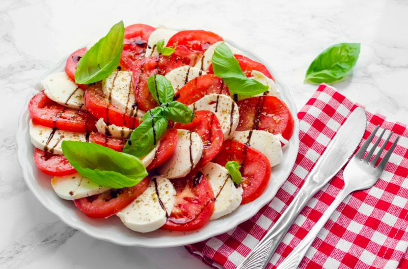 1. Салат "Капрезе" Классический итальянский салат, в нем собраны три продукта, которые описывают Италию - нежная моцарелла из молока черных буйволиц, лучший сорт томатов - "Бычье сердце" и листики базилика. Салат заправляется оливковым маслом холодного отжима и бальзамическим уксусом. Три цвета составляющих этого блюда напоминает флаг Италии - красный, белый и зелёный. Название салата произошла в честь острова Капри, где, по мнению большинства, он и появился. Существует две версии происхождения этого блюда: возможно салат был данью уважения итальянскому флагу или же он был создан чтобы отдыхающие члены королевской семьи и важнейшие политики насладились традиционным вкусом Италии. Рецепт: Нарезать кружочками моцареллу и томаты, выложить на тарелку вкруг чередуя кусочки. Посолить и поперчить. Заправить салат оливковым маслом и бальзамическим уксусом. Добавить листья базилика и можно подавать к столу! 2. Салат "Нисуаз" Классический французский салат из свежих овощей, варенных яиц, анчо