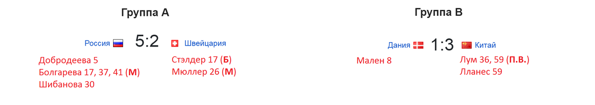 Здравствуйте, уважаемые любители хоккея. На женском олимпийском турнире завершился 2-й день. Расскажу о результатах, расписании, таблицах. Женская сборная России обыграла Швейцарию в стартовой игре 5:2. Во второй группе в это же время Дания и Китай держали интригу, пока в конце хозяйки Олимпиады не забросили дважды (3:1). Расписание на завтра. 5 февраля в группе А Канада сыграет с Финляндией, а России придётся сразится с олимпийскими чемпионками США. Начало: 16:10 по Москве. В параллельной группе Япония встретится с Данией, а Чехия – со Швецией. Лучшие игроки: Спунер и Томпсон из Канады набрали по 5 очков. У Тернбулл, Джонстон и Лум по 4 балла. БОлгарева из России забросила больше всех (3 шайбы). У Томпсон – 4 паса. Таблицы. В группа А, где сосредоточены самые сильные сборные мира, Канада на первом месте. Смотрите наш выпуск, в котором я объяснял схему мужского и женского турниров. Встретимся завтра.
