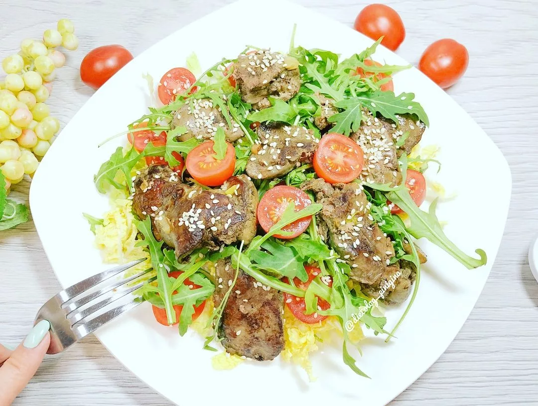 Салат с печенью, рукколой и помидорами Калорийность на 100г: 105 Ккал Белки: 7.5г Жиры: 5.9г Углеводы: 5г Ингредиенты: Куриная печень - 300 г Руккола - 100 г Пекинская капуста - 300 г Помидоры черри - 6 шт Кукурузная мука - 2 ст.л. Оливковое масло - 1 ст.л. Кунжут - 1 ч.л. Соль, черный молотый перец - по вкусу Соус: Оливковое масло - 2 ст.л. Бальзамический уксус - 1 ст.л. Приготовление: 1) Промыть куриную печень, посолить, обвалять в кукурузной муке и поджарить до готовности на оливковом масле. 2) Пекинскую капусту порезать и выложить на дно тарелки. 3) Сверху положить рукколу, помидоры черри, затем печень. 4) Сделать соус, смешав оливковое масло с бальзамическим уксусом. 5) Полить салат соусом и посыпать кунжутом. Помидоры с творогом и чесноком Калорийность на 100г: 41 Ккал Белки: 6г Жиры: 0.3г Углеводы: 4г Ингредиенты: Творог обезжиренный - 100г Помидор - 1-2 шт Огурец - 1 шт Болгарский перец - 1 шт Чеснок - 1 зубчик Натуральный йогурт - 2 ст.л. Укроп - по вкусу. Приготовление: 1)