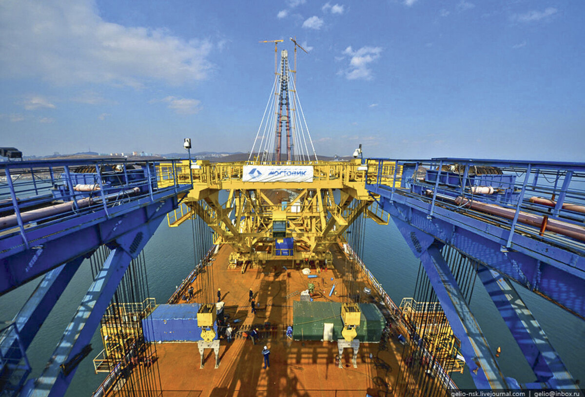 Руки делают. Разработчиком проекта строительства моста на остров Русский, минуя процедуру тендера для экономии времени, выступил «Мостовик», он же вместе с «УСК МОСТ» стал его генеральным подрядчиком. ТМК стала генподрядчиком двух других мостов. Наибольшую сложность представлял первый, так называемый Русский мост, ибо как раз через Босфор-Восточный строятся все логистические цепочки грузоперевозчиков, и нарушать их графики было нельзя. Начинать предполагалось с того, что ранее в России не делалось — с морского бурения на глубине 77 метров (глубина залегания прочных пород) для подготовки специальных площадок в проливе, на которых предстояло соорудить пилоны второго в мире по высоте (324 м, 336 м у французского виадука Мийо) вантового моста с самым длинным в мире наибольшим пролетом (1104 м, общая длина — 3,1 км). Для пилонов нужно было забить в грунт и забетонировать особо прочной смесью 120 буронабивных свай диаметром 2 метра — соорудить «коренные зубы» будущего моста.