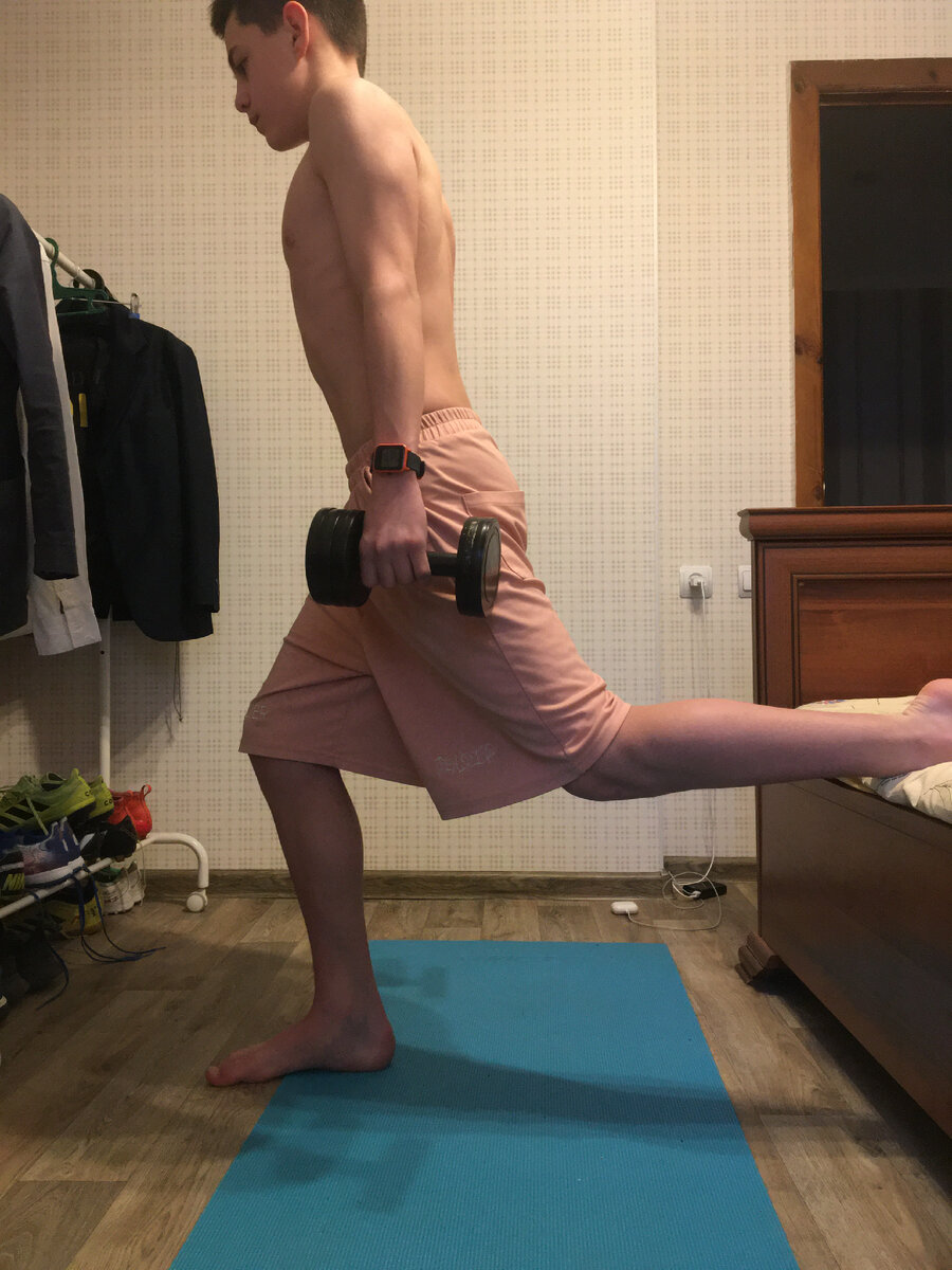 Всем доброго времени суток , сегодня я вам покажу и расскажу про три классных упражнения на бёдра. Поехали! И так в первом упражнении нам понадобятся гантели. Берём гантели в руки и становимся рядом со стулом или рядом с кроватью , одну ногу ставим на кровать а вторая нога на полу. И начинаем приседать на одной ноге. Выполняем упражнение 15 раз на одной ноге. Это исходное положение. И далее приседаем. Второе упражнение это тоже приседания но только на двух ногах , мы берём гантель в обе руки , делаем присед под 90°. Самое главное выполнять это упражнение с ровной спиной , чтобы не навредить себе. Это наше исходное положение. Все упражнение выполняем я прямой спиной. И третье упражнение называется пистолетик , это упражнение выполняется около стены. Мы облокачиваемся об стену спиной и ноги вперёд, делаем угол 90° и стоим так 30-40 секунд. На фотографии будет показано. Это очень классное упражнение главное надо стоять и просто не двигаться. Выжимаем из себя всё. На этом упражнения н