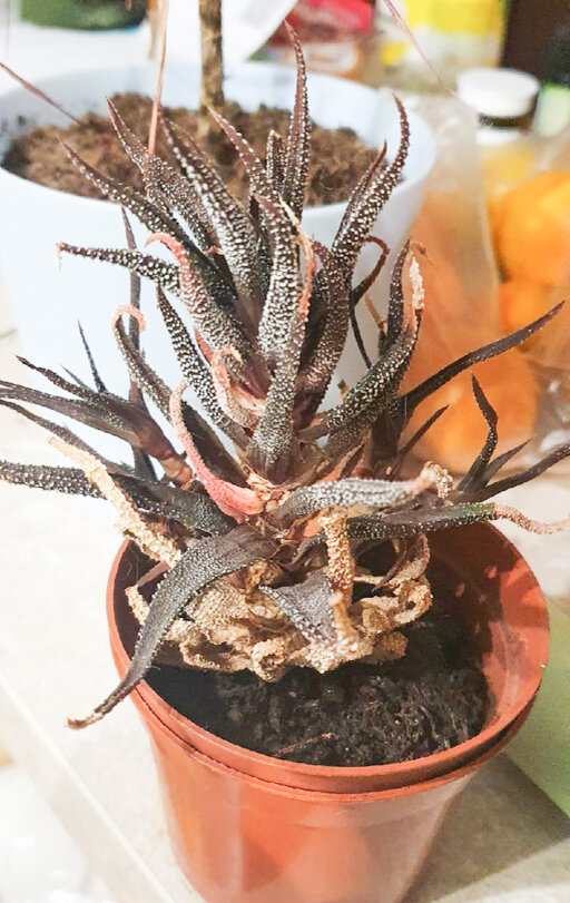 В декабре написала мне знакомая, можно ли воскресить это растение. Фото прилагаю. Спросила, есть ли у меня статьи по тому, как вот это вот оживить. Мне показалось что растение еще живо. Я посоветовала: "Достать из горшка, отряхнуть грунт, если не отряхивается с водой смывать, заодно все сухие листики убрать. Если есть белые (иногда желтоватые) корни то все ок, посадить в другой грунт, если все корни коричневые другой порядок действий." Цветовод начинающий, вопросов много. В ходе переписки я решила, что заберу это растение и попробую сама привести его в порядок, если это еще возможно. Осмотр корней показал что их нет. Хавортия не была пересажена после покупки и сидела в транспортировочном грунте, который слежался и явно не подходил для длительного содержания в нем растения. На растении заметила щитовку. Но видимо на таком сухарике ей было не чего есть и она не выжила. Но. Это же суккулент. И как выяснилось очень живучий. Даже сидя без корней и полива, это растение очень хотело и пы