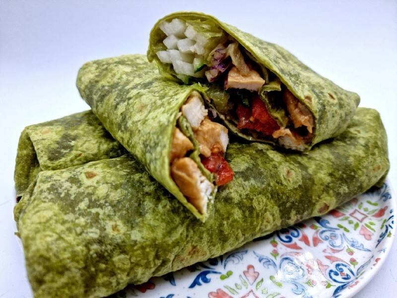 Блюдо можно отнести практически к ПП или сделать его веганский аналог Ингредиенты: куриного филе, шампиньонов, соуса Якитори, Овощи: салат айсберг, огурец, лук, помидор, редька, растительного масла Способ приготовления: Курицу и грибы (у веганов только грибы, но больше) нарезать и на 20 минут замариновать в якитори. Обжарить на разогретом масле. Овощи нарезать любым удобным способом. Завернуть в шпинатную тортилью. Можно припечатать грилем или не делать этого.