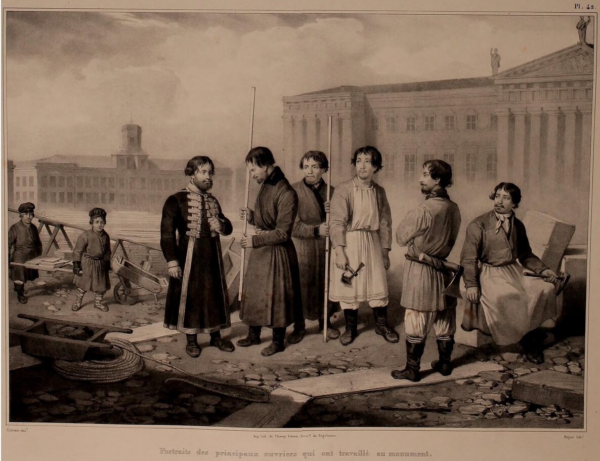 Работа над Исаакиевским собором, которой я занимаюсь уже двадцать лет, позволила мне всё больше и больше ценить этот трудолюбивый класс людей, которые каждый год приезжают работать в Санкт-Петербург. Я заметил в них качества, которые в такой высокой степени трудно было бы найти в другом месте. Русские рабочие честны, мужественны и терпеливы; одарённые необыкновенным умом, они легко понимают и выполняют в точности то же. Каждая профессия относится (связана с) к определённой провинции империи; так, большинство каменщиков - из губернии Ярослава, плотники - из Костромы, гранитчики и мраморщики - из губернии Олонца. Камнерезы из Путилова. Они нанимаются зимой подрядчиками и прибывают в Санкт-Петербург на Пасху, после чего начинается работа. Эти работники, как правило, высокие и сильные, добрые, с мягкой откровенностью, которая заставляет человека любить их и привязываться к ним. В течение всего времени, пока они оторваны от своих семей, они живут в компании пятнадцати или двадцати мужчин (артелью), и каждый из них вносит в месяц определённую общую сумму денег на своё питание. У каждой артели есть свой повар и два рабочих, которые приносят дрова, топят печи и приносят необходимую воду и провизию. У них также есть голова, или доверенное лицо, для ведения счетов их артели. Их пища хороша и полезна; она состоит из различных каш, свежего мяса, капусты и рыбы. В праздничные дни они готовят очень аппетитные пироги с рисом и рыбой; употребляют напиток из перебродившего ячменя. Несколько раз я принимал участие в их трапезах, и должен признаться, что трудно съесть лучший суп с хорошими кусками мяса, чем тот, который они мне предложили.