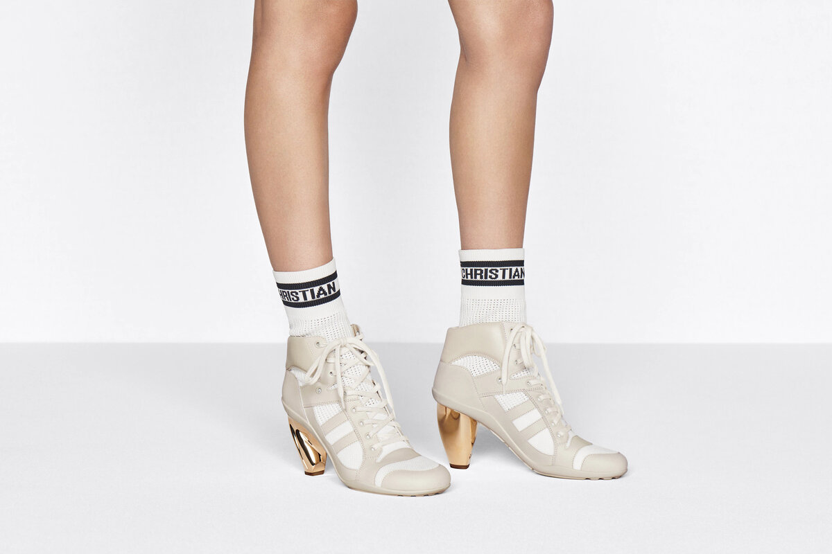 Странный силуэт вызвал разногласия среди поклонников моды. Модный Дом Dior представил необычную гибридную модель обуви в духе 2000-х годов. Силуэт D-Zenith, объединивший элементы спортивного стиля и изысканную форму ботильонов, стал воплощением возвышенной эстетики французского бренда. Модель сочетает в себе белую трикотажную основу и кремовые вставки из телячьей кожи. Изюминкой изделия стал интегрированный в дизайн обуви носок с фирменным логотипом CHRISTIAN DIOR. Шнуровка, сетка и резиновая подошва подчеркивают спортивный стиль обуви, а золотистый каблук, форма которого была вдохновлена скульптурами французского архитектора Константина Бранкузи, добавляет силуэту нотки высокой моды. Приобрести ботильоны D-Zenith можно в фирменных бутиках Dior за $1 490.