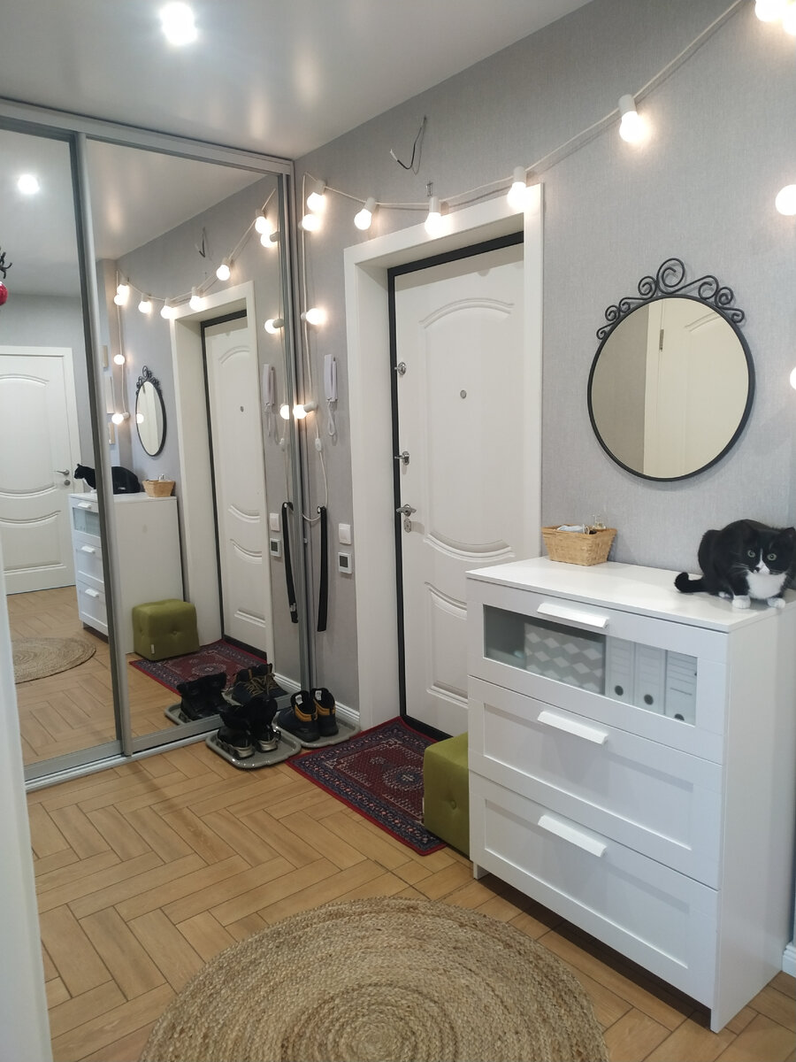 Всем привет! В своем блоге я хочу рассказывать и показывать, как устраиваю быт в семье с двумя маленькими детьми. Одновременно с этим учиться чему-то новому и совершенствоваться. Итак, начнем. Дом начинается с прихожей, моя первая статья об этом. Прихожая у нас проходная, поэтому нет возможности отделить грязную зону, кроме как ковриком. На входе справа у нас стоит зеркальный шкаф –купе для всей верхней одежды и обуви всей семьи, это очень удобно: зашел и сразу повесил на плечики куртку, закрыл дверцу и никаких завалов. У детей есть своя штанга, она им по росту отлично подходит. Внизу вся обувь стоит в лотках, можно ставить даже грязную обувь, песок не разнесется по всему дому. Еще в шкафу есть крючки для хранения детских рюкзаков, мешков для сменки, ведь их тоже где-то надо хранить, т.к. их много. Так же в прихожей есть вешалка с крючками, куда можно повесить влажные детские вещи, например, после прогулки или дождя, затем убрать в шкаф. Слева от входа в прихожей стоит комод с зеркалом