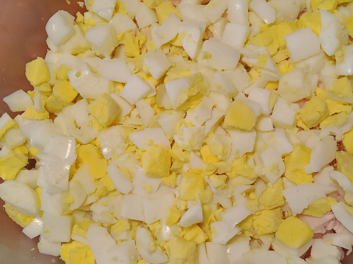 Этот салат я попробовала и удивилась как же восхитительно и легко сочетаются все продукты. А изюм и орешки кешью вообще покорили меня, до этого я никогда не пробовала что то подобное. Гостей я тоже успела удивить и рецепт просили все без исключения. Начнем готовить! Нам понадобится: Для начала нарежем курицу и яйца. Вся нарезка должна быть примерно одного размера, тогда все ингредиенты хорошо чувствуются и вкус более насыщен всеми компонентами салата. Нужно промыть изюм и замочить в немного теплой воде, что бы он напитался и стал не такой сухой, так намного вкуснее. Разломать орешки кешью на половинки, можно и меньше, это как кому нравится, мне, например, нравится ощущение хруста орехов. Отваренную морковь нарезаем на кубики и добавляем в салат. Нарезаем киви, добавляем консервированную кукурузу без сиропа (его нужно слить с банки) и все хорошо перемешиваем. После добавляем майонез и ещё раз перемешиваем. После того как салат заправлен, выкладываем в форму для подачи и украшаем или д