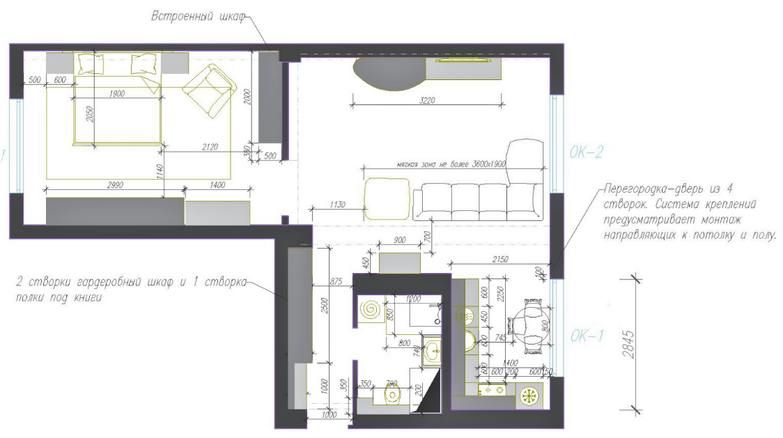Данная квартира находится на одном из центральных проспектов города Алма-Аты, в Казахстане. Владелица квартиры женщина в возрасте, которая захотела сделать интерьер более светлым, просторным и воздушным. Именно поэтому основные цвета в дизайн-проекте светлые, и вместо распашных темных дверей, появилась зеркальная белая раздвижная дверь. Проект Прихожая Одним из пожеланий хозяйки было сделать больше зон для хранения, без перепланировки. Поэтому в прихожей полностью заменили старую отделку и старые шкафы из 90-х. Их заменили на новые светлые шкафы, с зеркальными вставками в дверях. Так же у входа расположили мягкую кушетку, а под ней открытая секция под обувь. А над кушеткой сделали небольшие антресольные шкафы. Напольное покрытие выложено плиткой. Гостиная Весь проект начался с одной главной детали гостиной - это большая раздвижная стеклянная дверь. Данную дверь очень хотела сама владелица квартиры, так как предыдущие распашные её не устраивали по многим причинам, начиная от того, что о