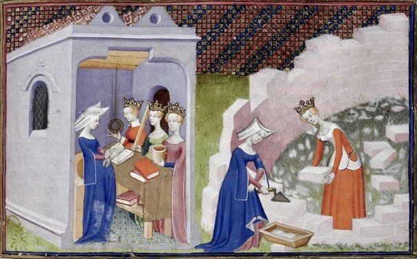 Женщины действительно в Средние Века могли владеть различными профессиями и часто подменяли мужчин на важных должностях. В статье, в которой мы об этом рассказывали, были использованы рисунки того, как женщины в пышных платьях и головных уборах выполняли чисто мужскую работу. Такого, конечно, не было - работать таким образом, как минимум, неудобно. Эти рисунки из произведения "Город Женщин" за авторством Кристины Пизанской. Иллюстрации тоже ее. В свое время дама была известна - и своими стихами, песнями, но писала она также и серьезные вещи - по снабжению войск продовольствием и даже по военному делу (ссылаясь на военных специалистов- современников) Сейчас самой знаменитой книгой является "Град Женский", но тогда по причине ее написания Кристина впала в немилость. Издание подобной книги и в XXI могло бы оказаться весьма резонансным, а уж в 1405... Что же там такого скандального? Сначала рассказчица цитирует более ранний труд "Стенаний Матеола" , где сообщается о том, что жизнь мужчи