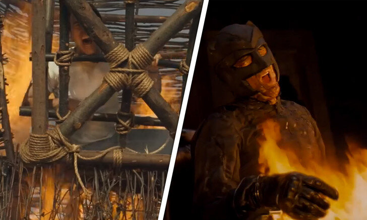 Прочитай, кому «посчастливилось» дважды сгореть, угодить в сеть и лапы Чудовища Франкенштейна. Николас Кейдж Смерть: сгорел заживо связанным. Фильмы: «Плетеный человек» и «Пипец». В ремейке классического фильма ужасов «Плетеный человек» 2006 года Николас Кейдж играет Эдварда Малуса, которого злобные язычники запечатывают внутри гигантского плетеного чучела и поджигают.