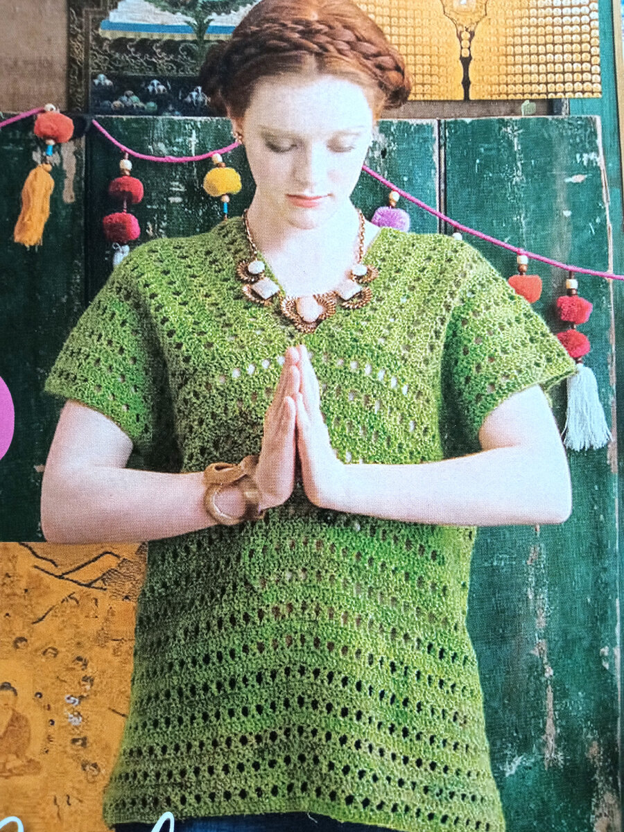 Размеры: S, M, L Размеры готового изделия Окружность груди: 94 (101,5; 111,5; 124,5) см Длина: 58,5 (58,5; 62, 64) см Вам потребуется: 6 (7, 8, 9) мотков пряжи Noro/KPI Silk Garden Lite Solo (45% мохера, 45% шёлка, 10% шерсти, 124м/50г) цвета №7, крючок №3,25, 6 маркеров с защёлкой. Узор из перекрещенных столбиков: число наборных п. кратно 3 + 1. 1-й (изн.) р.: вязать 1 ст. с/н в 4-ю возд. п. от крючка и в каждую возд. п. до конца р., повернуть работу. 2-й (лиц.) р.: 4 возд. п. (вместо 1-го ст. с 2/н), пропустит 1-й ст. с/н, *перекрестить след. 3 п. след. образом: (сделать 2 накида, ввести крючок в след. п., вытянуть нить и протянуть её через 2 п., сделать накид и пропустить след. п., ввести крючок в след. п., вытянуть нить и протянуть через 2 п., сделать накид и протянуть через 3 п., сделать накид и протянуть через последние 2 п., затем провязать 1 возд. п., сделать накид и обвести крючком в направлении сзади вперёд и снова назад ножку 1-го ст. с/н, сделать накид и вытянуть нить, сдел