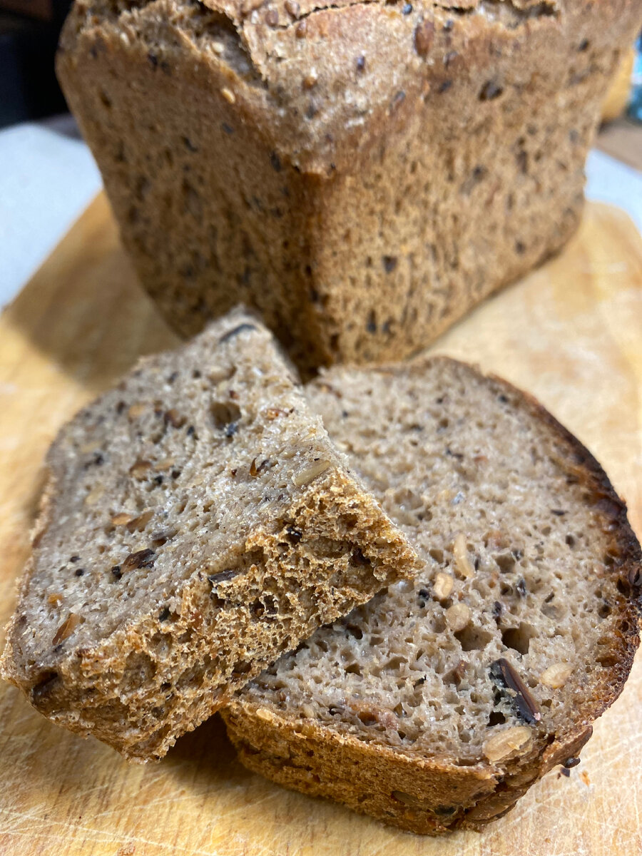 Я тут продолжаю с ржаной закваской баловаться, поэтому вот - новый хлебушек 🍞 Привожу оригинальный рецепт на две большие буханки хлеба (по 950 гр). Я урезала рецептуру для одной формы Л7. Нам с мужем столько хлеба вдвоём не осилить😂 Хоть он и очень вкусный… Давайте готовить! Ингредиенты (На два больших хлеба по 950 гр каждый) МОЧКА Залить холодной водой минимум на час. Я оставляю на ночь. Сверху чем-нибудь прикрыть, чтобы влага не испарялась. ❗️Перед добавлением в тесто воду не сливать. ОПАРА Смешать. Оставить при комнатной температуре на 6-8 часов. ТЕСТО Я адаптировала рецепт под одну буханку 720 гр (форма Л7). Приготовление Смешиваем опару, воду и всю муку. Оставляем на полчаса - это аутолиз. Он нам нужен для красивого мякиша. Затем замес теста, в процессе которого вводим соль и всю мочку. Я замешиваю тесто руками: до развития нужной степени клейковины уходит минут 15. Если доверить это дело комбайну - в два раза меньше. Брожение 3-4 часа с двумя обминками.