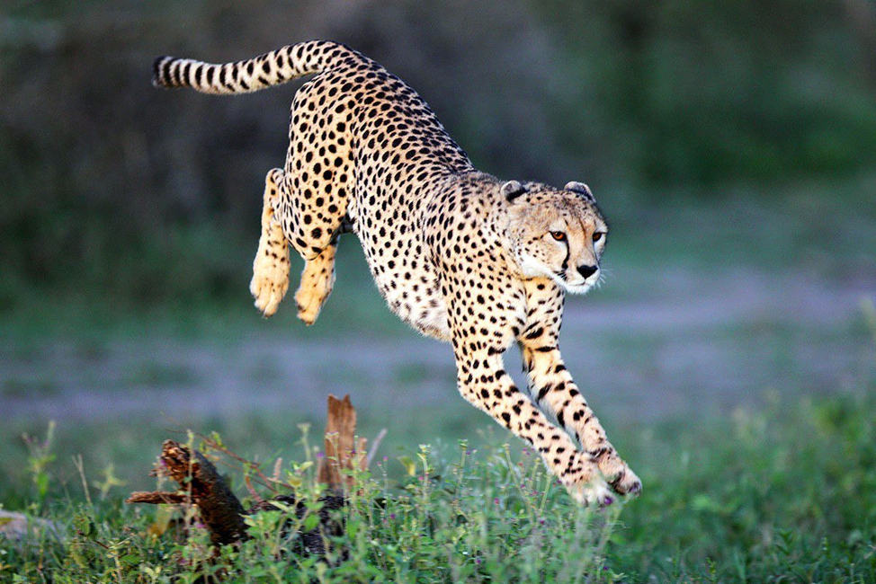 Гепард, который весит 60 кг в беге на короткие расстояния (примерно 500 метров) и при благоприятных условиях может достигать скорости от 96 до 120 км/час. В течение 2 секунд его скорость равна 70 км/час, через 3 секунды – 100 км/час, а через 5 секунд – 120 км/час. Гепард распространен на открытых низменностях восточной части Африки, к югу от Сахары. В Азии он обитает от Аравийского полуострова до Ирана и Туркмении. На всей территории обитания он является редким животным. Гепарды могут вести уединенный образ жизни, а могут и объединяться в стаи. Пищей гепарда становятся мелкие антилопы, газели, дикие зайцы и обитающие на земле птицы. Самка гепарда может производить на свет от 2 до 4 детенышей, которые очень любят играть. Гепард является млекопитающим, принадлежащих к семейству кошачьих, отряд плотоядных. Имеет стройное туловище, длинные ноги и маленькую круглую голову. Шесть серо-желтая, на брюхе более светлая, кремовая. От глаз до кончиков губ проходят тонкие черные полоски. Все тулови
