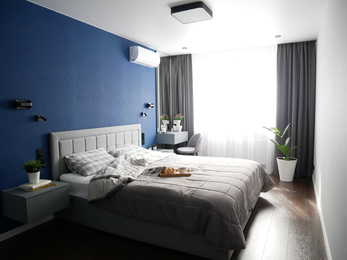 По желанию клиентов, мы добавили в интерьер акценты синего и зеленого цветов. А именно синий диван в зоне гостиной, синие обои в спальне и зеленую декоративную штукатурку в прихожей.