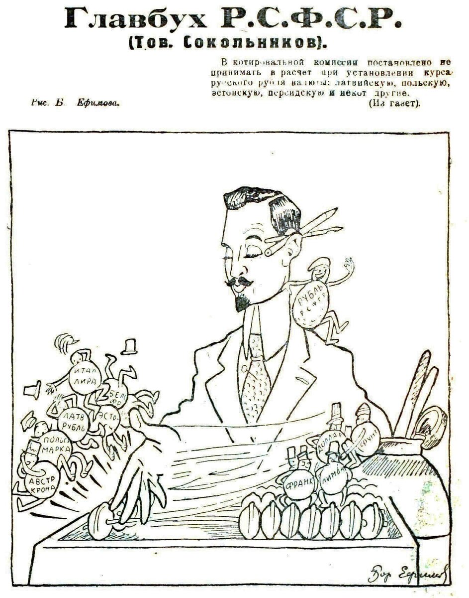 Карикатура Бориса Ефимова «Главбух Р.С.Ф.С.Р. (тов. Сокольников)» традиционно сопровождалась цитатой из прессы: «В котировальной комиссии постановлено не принимать в расчет при установлении курса русского рубля валюты: латвийскую, польскую, эстонскую, персидскую и некоторые другие (из газет)».