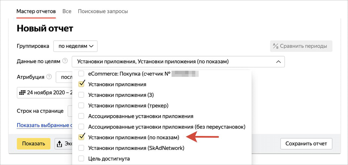 В новом интерфейсе Рекламы мобильных приложений при вставке трекинговой ссылки можно включить атрибуцию по показу. В Мастере отчетов такие установки будут отображаться как отдельная метрика. Однако в дашбордах трекеров иногда показываются все инсталлы вместе: по кликам и по показам.