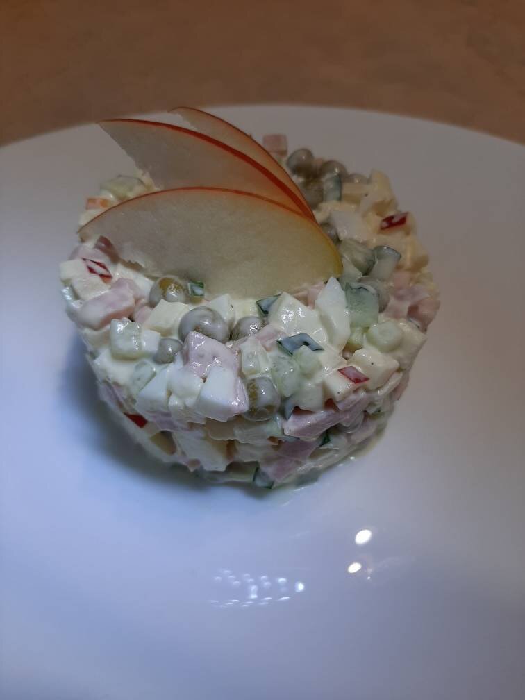 В нашей семье прижилось именно это название. Получается салат, напоминающий Оливье, но при этом очень свежий и лёгкий. Да и готовится гораздо быстрее! Ингредиенты: крупное яблоко, средний огурец, нежирной ветчины, консервированного горошка, яиц, майонез, соль , чёрный перец молотый Способ приготовления: Все продукты необходимо нарезать мелкими кубиками. Сначала яблоко, лучше взять кисло-сладкое. Затем свежий огурец. Ветчина. У меня ветчина куриная. С горошка тщательно слить воду и добавить туда же. Пока все эти продукты будут нарезаться, необходимо отварить яйца. Яйца можно порезать, а можно натереть на крупной тёрке. Добавить майонез по вкусу, подсолить и поперчить. Все перемешать и можно кушать. Приятного аппетита!