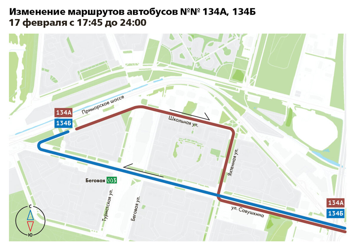 7 февраля с 17:45 до 24:00, в связи с временными ограничениями движения по Яхтенной улице и Рюхиной улице из-за проведения футбольного матча на стадионе «Газпром Арена», изменятся трассы автобусных маршрутов №№ 134А, 134Б, К-131, К-232, К-690.