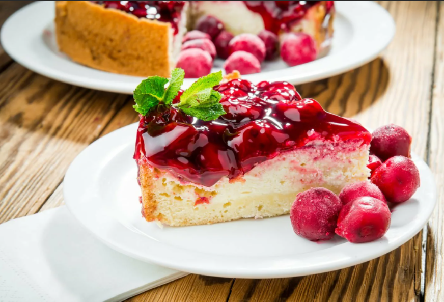 Творожная запеканка с вишней Ингредиенты: -Творог 5% 550гр - Сметана 90 гр (можно ряженку/кефир) Сахарозаменитель 4 гр Ванилин Соль щепотка тесто. Яйцо 2 шт Варенье любое 80 гр (у меня клюквенное) Крахмал кукурузный 20 гр Рисовая мука 50 гр Вишня замороженная 300 гр Приготовление: 1.Творог смешать с сметаной, сахарозаменителем, ванилином и солью. 2. Добавить яйцо и варенье. Тщательно перемешать. 3. Всыпать в смесь муку крахмал, замесить. 4. Выложить тесто в форму и сверху выложить ягоду. 5. Отправить в духовку на 50 минут при 180 градусах. Калорийность на 100 грамм - 128 ккал БЖУ 9/4/13