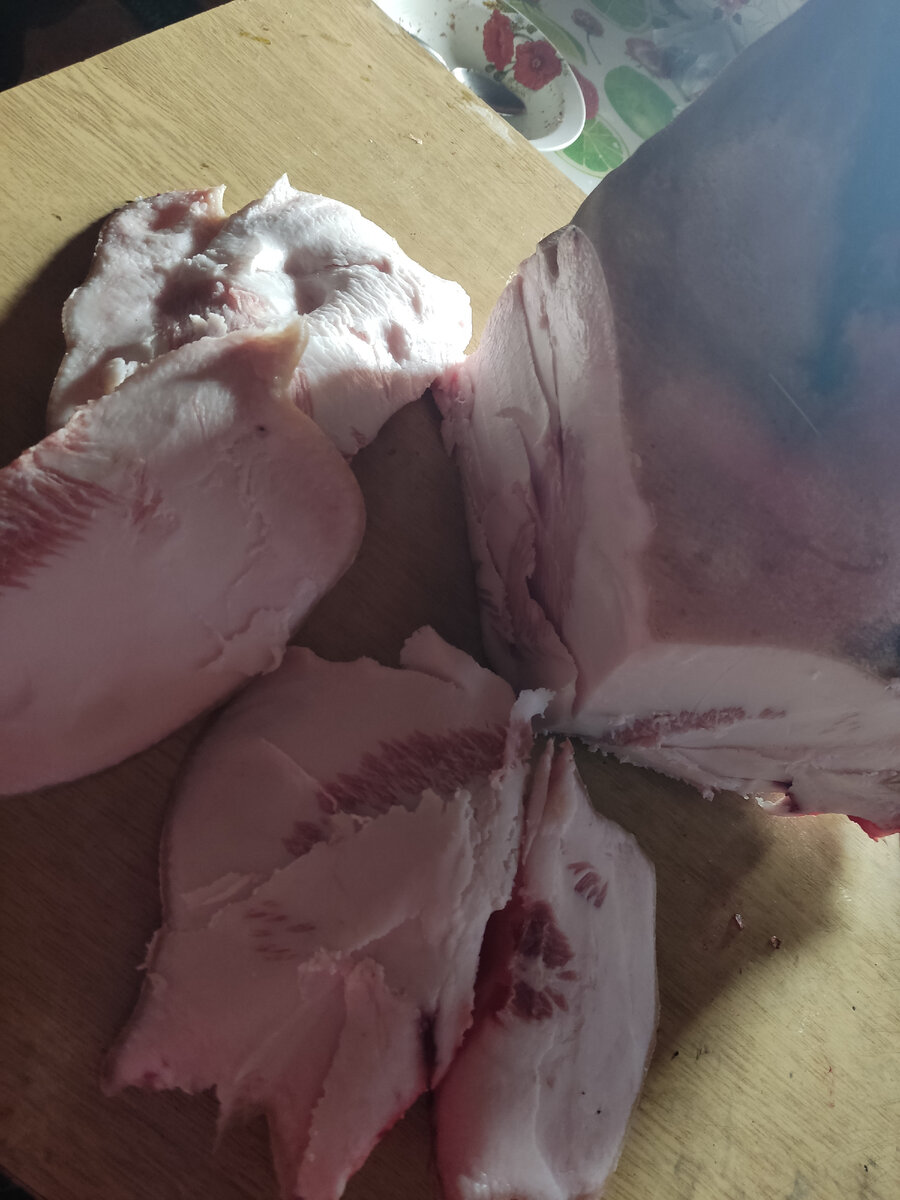 У нас тут голову свиную и за так не хотят брать если предлагаешь,не то что купить.Перекупы берут за копейки и то чисто из-за языка,хотя язык не хило стОит.Потому что возиться с ней никто не хочет.Надо обрезать сало с головы,глаза выковыривать))))) Собакам варить тоже мне жалко,приходиться возиться с холодцом.Ещё воды то нет в доме(провели в прошлом году,только напора нет совсем,а насос пока никак не поставим),надо всё жирное мыть на улице. Поэтому у меня по -простецки.Сложных путей не ищу). Голову обрезаем от сала и потом рубим на 4-6 частей,я даже язык не вырезаю,потом сварится всё равно в холодец пойдет. Замачиваю на ночь.У меня 20тка кастрюля.Я в ней и варить буду.В нее влезает голова порубленная и 3 рульки.Как порубить,может и поменьше вместиться. Утром я когда свои дела поделаю,перемываю куски,выковыриваю глазки,мою хорошо ротик......у поросенка)))))))))))).Заливаю заново водой чтобы чуть покрывало мясо и ставлю на огонь вариться. Если в свинине мало мяса,можно кусочек кинуть