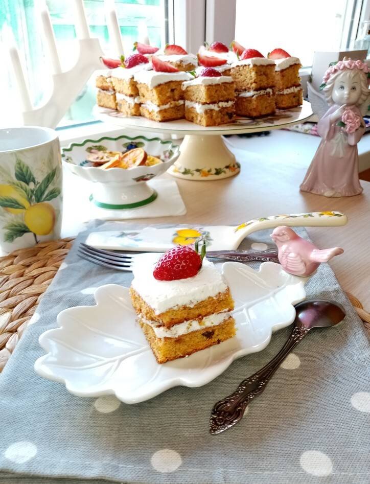 #игры Здравствуйте, Прекрасные Хозяюшки! 💖 Сегодня хочу предложить Вам нежный , полезный, в меру сладкий и очень вкусный Яблочно-Морковный десерт ! Нотка мускатного ореха с корицей это очень нежно, ароматно и вкусно. И так давайте готовить?) Ингредиенты: муки, сахара, яйца, разрыхлителя, раст масла, моркови, яблоко, мускатного ореха, корицы, темного шоколада, Ваниль, Крем, сливок 33%, крем сыра, сахарной пудры, Украшение, Клубники Способ приготовления: В миску с яйцами добавляем сахар, масло, ваниль, взбиваем миксером. Добавляем муку, мускатный орех, корицу, разрыхлитель, кусочки шоколада, хорошо перемешиваем. Добавляем в тесто натертую (на мелкую терку) морковь, и натертое яблоко (на крупную терку) Перемешиваем. На противень застеленный пергаментом, выливаем тесто, разравниваем лопаткой. Выпекаем в предварительно разогретой духовке ~30 мин., при 180 *. Достаём из духовки, даём немного остыть, переворачиваем и убираем пергамент. Разрезаем на две части (пополам, не вдоль) Готовим крем.