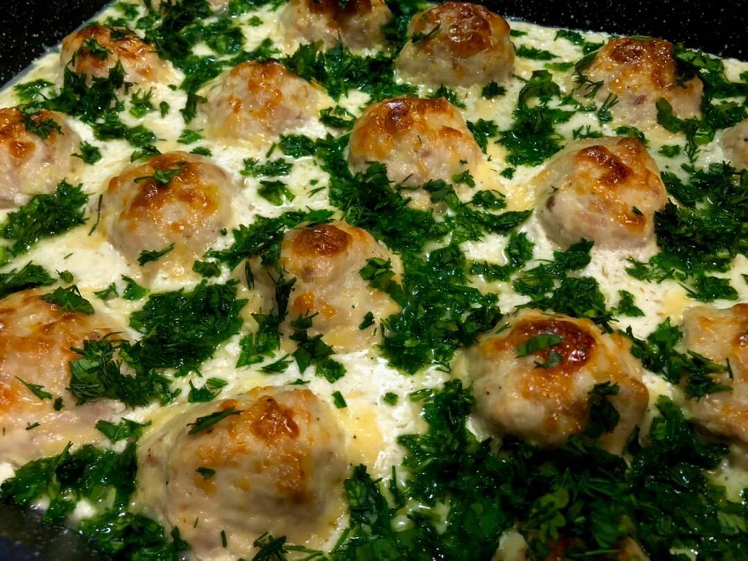 КБЖУ на 100 гр: Ккл 160.16, Б 10.71, Ж 10.71, У 1.18 Ингредиенты: куриного фарша, яйцо, луковица, чеснока, сметаны 15%, Твёрдого сыра 45%, сливок 10%, растительного масла, соль, перец, зелень Способ приготовления: 1.В куриный фарш добавляем яйцо, лук пробитый через мясорубку, соль и перец. Всё хорошо перемешать. Форму смазать растительным маслом, из фарша сформировать шарики, выложить в форму и отправить в разогретую до 180 градусов духовку на 30 минут. 2.Для соуса в чашку выливаем сливки, натираем сыр, добавляем сметану, выдавливаем чеснок, солим и перчим и перемешиваем. 3.Через 30 минут достаём форму с куриными шариками и заливаем соусом, ставим обратно в духовку на 15 минут. Посыпаем зеленью и кушаем🤤. 🥘Приятного аппетита.