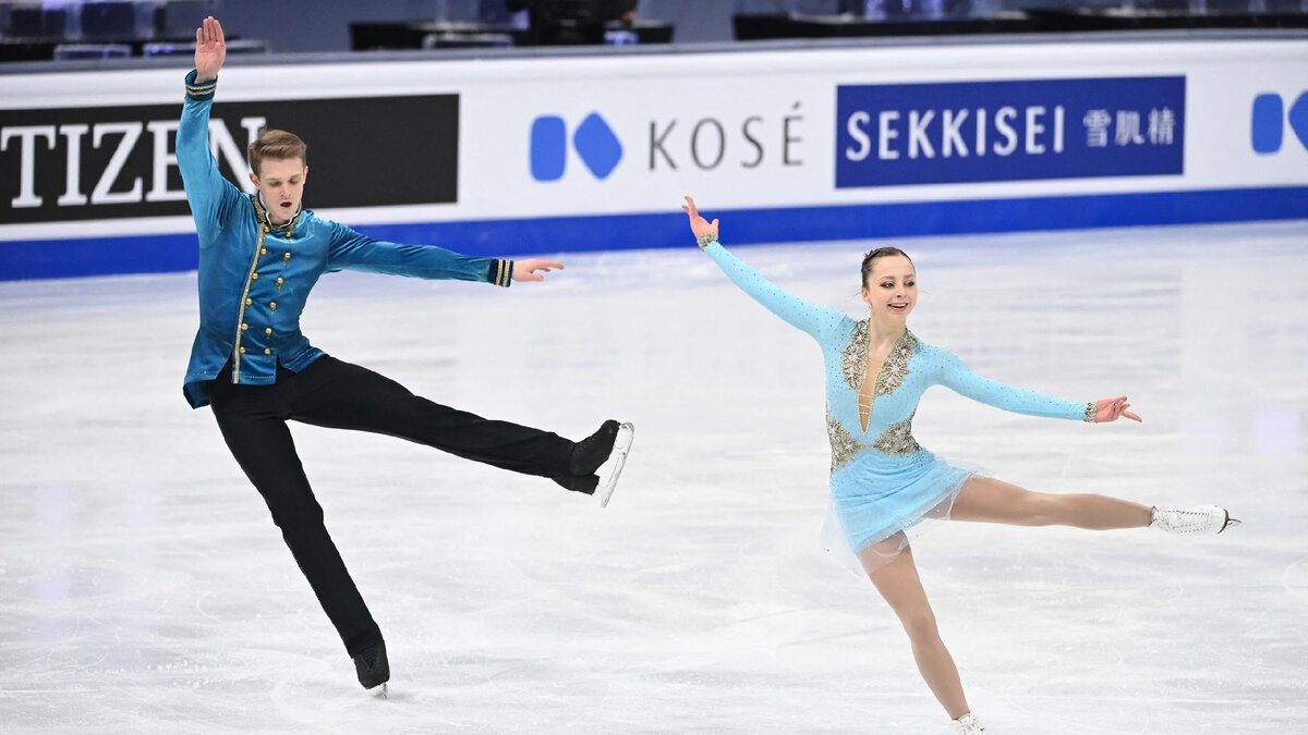 Итак, Анастасия Мишина и Александр Галлямов. Ребята начинают вращение с прыжка (бедуинский прыжок). Это первая черта у них (сложный заход во вращение). Далее они исполняют сложную вариацию позиции либела (в кольце). Это черта позволяет им уже использовать две черты для одной ноги, то есть они уже набрали два уровня. При этом в сложной позиции у них исполнено более 6 оборотов, так что если вдруг арбитры не зачтут прыжок как сложный заход (в случае если он получился бы у них как перескок), то они получат вторую черту за этот пункт. Далее у ребят идет смена ноги и переход в сложную вариацию позиции волчок (тут третья засчитанная черта и уже 3 уровня есть). Также ребята исполняют в ней больше 6 оборотов, но четвертую черту они получают за переход в позицию стоя (тоже сложной вариации). В ней они делают меньше 6 оборотов, но больше необходимых 3. Кратко: у ребят сложный заход или 6 оборотов в одном положении без смен (1 уровень), сложная вариации либелы (2 уровень), на другой ноге сложная вариация волчка или 6 оборотов (3 уровень), сложная позиция стоя (4 уровень)