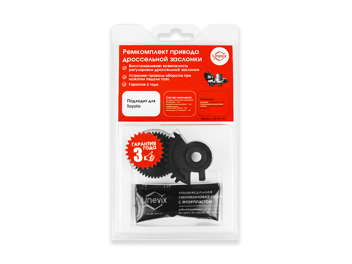 Дроссельная заслонка вашего автомобиля работает некорректно? При нажатии педали газа обороты не увеличиваются? Причина в износе шестерни привода регулировки дроссельной заслонки. Это популярная проблема среди владельцев автомобилей Toyota Caldina, Corolla, Sprinter, укомплектованных дизельным двигателем 3C-E. Решите проблему просто - с помощью ремкомплекта привода дроссельной заслонки! Ремкомплект привода дроссельной заслонки: ✔ Восстанавливает возможность регулировки дроссельной заслонки. ✔ Устраняет провалы оборотов при нажатии педали газа. Состав комплекта: КАК ЗАМЕНИТЬ, ПОЧИНИТЬ ПРИВОД ДРОССЕЛЬНОЙ ЗАСЛОНКИ С ПОМОЩЬЮ РЕМКОМПЛЕКТА: 1. Выкрутите два винта крепления электродвигателя, выньте его из корпуса привода. 2. Выкрутите 2 винта крепления крышки, снимите крышку. 3. Плоскогубцами снимите запорную шайбу, извлеките промежуточную шестерню. 4. Выкрутите контр-гайку фиксирующую пружинно-возвратный механизм, извлеките его из корпуса. 5. Поменяйте изношенные шестерни на новые, будьте а