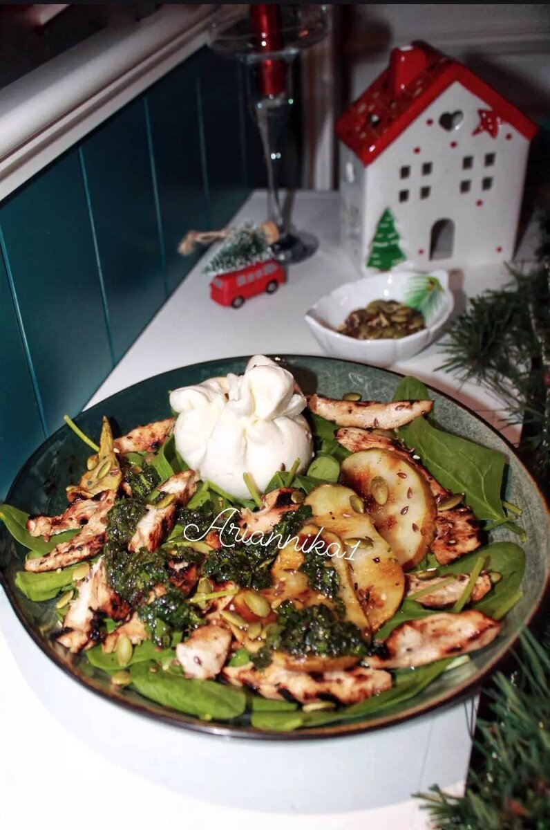 Невероятный рецепт. Взрыв вкуса. САЛАТ С КУРИЦЕЙ, КАРАМЕЛИЗОВАННОЙ ГРУШЕЙ И БУРРАТОЙ, где курочка и груша хорошо сочетаются между собой, а заправка придаёт салату невероятную нотку и яркий вкус. Этот салат оставит самые незабываемые впечатления на любом праздничном мероприятий. Немного с заморочками, но он того стоит. Ингредиенты: куриное филе, крупная груша, семян тыквы, семян льна, кунжута, оливкового масла +, уксуса для, курицы (бальзамического или яблочного), меда, соль, перец, тростникового сахара, буррата, шпината, Для заправки:, мяты, оливкового масла, уксуса яблочного, меда, соль Способ приготовления: 1 небольшое куриное филе нарезаем нетолстыми стейками. Замаринуем: 1-2 ст л оливкового масла, 1 ч. л.уксуса, 1 ч. л.меда, соль, перец. Перемешиваем и оставляем мариноваться около 30 мин. 1 большую грушу нарезаем ломтиками, толщиной 4 мм. С каждой стороны слегка смазываем мёдом (понадобится ~ 1 ст л) и посыпаем тростниковым сахаром (~1 ч л). Приготовим мятное песто: в чаше блендера