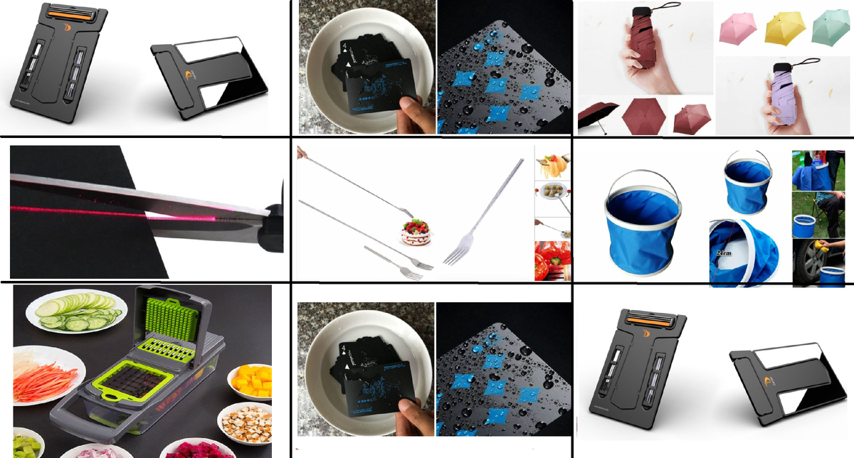 1. Пластиковые игральные карты. Колода оригинальных пластиковых карт чёрного цвета с синими рисунками. Материал — пластик, благодаря которому вода не сможет испортить изделие. В упаковке 54 карты, включая двух джокеров. Цена: 99 рублей. 2. Мини-бритва Компактная складная бритва в форме кредитки. Удобно брать в поездки: много места она точно не займёт. Цена: 290 рублей. 3. Компактный зонт Компактный зонтик с удобной ручкой и чехлом уместится даже в самой маленькой сумке и окажется под рукой в ненастный день. Цена: от 484 рублей 4. Ножницы с лазерным прицелом Инструмент на случай, когда нужно отрезать что‑нибудь максимально точно, а линейки и мелков под рукой нет. Цена: 459 рублей. 5. Телескопическая вилка (длинная) Телескопическая вилка отлично подходит для того, чтобы взять вон тот самый вкусный кусочек с другого края стола и при этом не потревожить соседа. Цена: 99 рублей. 6. Складное ведёрко Замечательное ведро для рыбалки, похода и любой другой поездки на природу. Складывается в