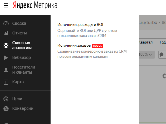 Таким образом, можно оценить реальную рентабельность каждого рекламного канала и принять решение, что развивать, а где нужна оптимизация. В Яндекс метрике появился раздел – «Сквозная аналитика». Теперь можно отслеживать окупаемость рекламы в разрезе всех используемых рекламных источников.