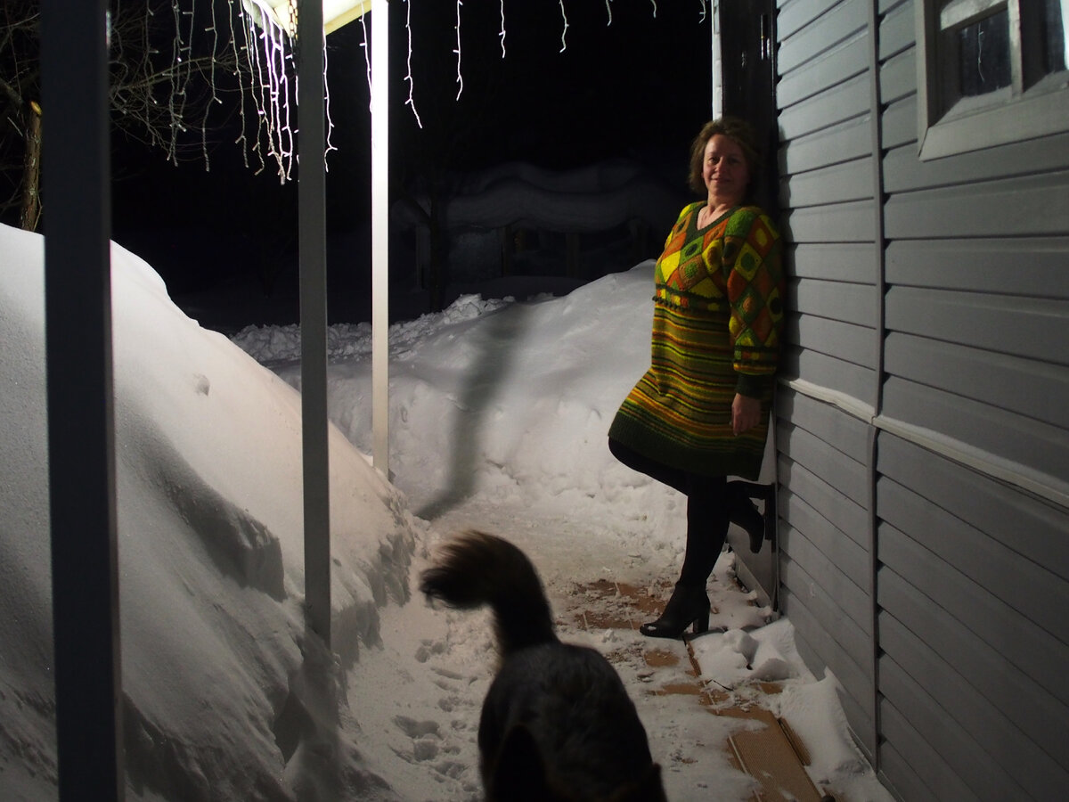А дойдя до пройм, загрустила - уж очень скучным мне показалось полосатить дальше. Стала думать. Долго. С первым снегом появились квадраты.