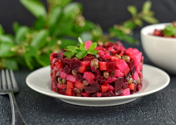 Салат из свеклы и квашенной капусты, классический рецепт. Будет уместен и в повседневной кухне, и на праздничный стол. Винегрет готовят из отварной свеклы, картофеля, моркови, квашенной капусты, с добавлением зеленого горошка, соленых огурчиков, репчатого лука и растительного масла. Ингредиенты: Для приготовления традиционного винегрета овощи ( свеклу, морковь, картофель) нужно предварительно отварить, затем нарезать на кубики. Смешать в миске квашенную капусту, отварные овощи, горошек, мелко нарезанный лук, соленый огурец, посолить. Заправить растительным маслом, по вкусу можно добавить лимонный сок. Вот и все, вкусный и оригинальный салат готов! Приятного аппетита! Делитесь в комментариях своими рецептами, что вы еще добавляете в винегрет? Ставьте лайки!