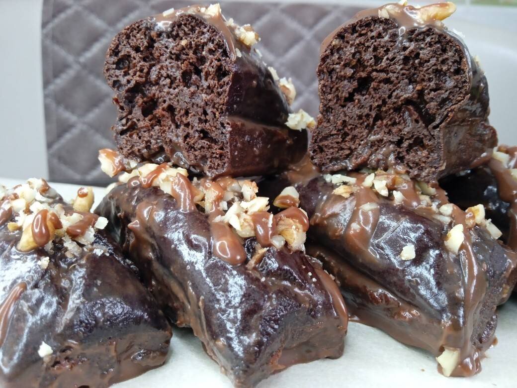 Кбжу на 100 гр :264/ 8/15/ 22 с шоколадом и грецким орехом Без : 194/9/10/15 Ингредиенты: Яйцо, гр Какао, Молоко 1.5 %, гр Творог мягкий (обезжиренный), Подсластитель, гр Масло подсолнечное, гр Овсяная мука, Разрыхлитель - 6 гр, Глазурь, посыпка, гр молочного шоколада, молока 1.5%, гр Грецкий орех Способ приготовления: Яйца + какао + молоко + творожок + масло подсолнечное + подсластитель + мука всё соединить до однородного состояния и разлить по формочкам или можно в одну, но небольшого размера диаметр 15 примерно, выпекаем в разогретой до 180 гр духовке 25 минут. Молоко разогреть добавить шоколад и перемешать до однородности, поливаем наш брауни и сверху посыпаем грецким орехом (его измельчить) Поставить в холодильник на час.