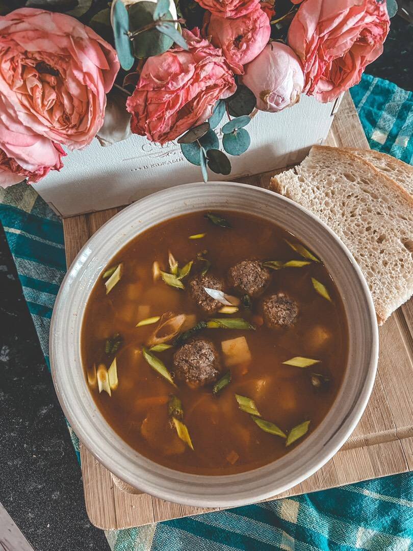 Ингредиенты: Фарш индейки , лук, морковь, картофель, томатная паста, сливочного сыра, копчёная паприка, Соль/перец , Зелень, чеснока Способ приготовления: Лук режем мелко, морковь трём на тёрке и обжариваем на сковороде, выдавливаем чеснок, добавляем томатную пасту и паприку. Наливаем в кастрюлю воду и ставим на плиту греться, как закипит добавляем порезанный кубиками картофель и нашу зажарку, солим и перчим. Пока готовиться картофель формируем из фарша фрикадельки небольшого размера. Трём сыр на крупной тёрке. К нашему картофелю добавляем фрикадельки и варим до готовности, в конце добавляем сыр и провариваем до расплавления. Наливаем в тарелку и украшаем зеленью. Приятного аппетита 😋