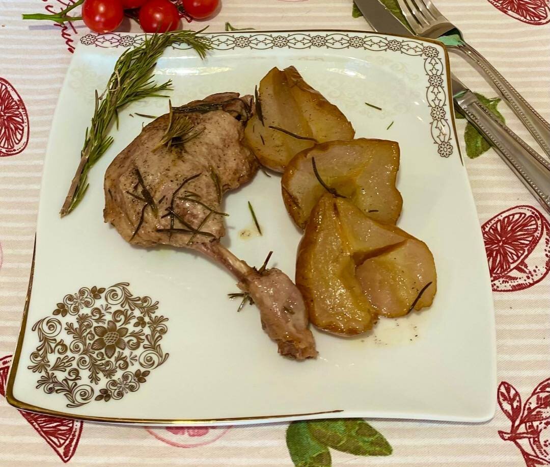 #утиныеножки #рецептысуткой Ингредиенты: Груша свежая, Утиное бедро, Сахар , Соль, перец , Розмарин свежий Способ приготовления: Утиные ножки заранее натираем солью и перцем и оставляем на 20 минут. Груши моем, разрезаем пополам. Удаляем плодоножку и вырезаем сердцевину с семечками. Груши лучше брать твёрдых сортов. В утятницу или глиняный горшок кладём утиные ножки, на них раскладываем веточки розмарина. Если у вас большее количество утиных ножек, то выкладываем их вторым и третьим рядом, прокладывая между слоями розмарин. Сверху на утиные ножки кладём груши кожурой вверх. Слой груш только 1 и он верхний. Сверху груши посыпаем сахаром и чёрным перцем. Запекаем в духовке при 180-200 градусах 1,5 часа. После уменьшаем температуру до 140 градусов и томим утку еще 20 минут. После выкладываем на тарелки и подаём к столу. Аромат божественный, груши вкусные, мясо тает во рту. Приятного аппетита 😘