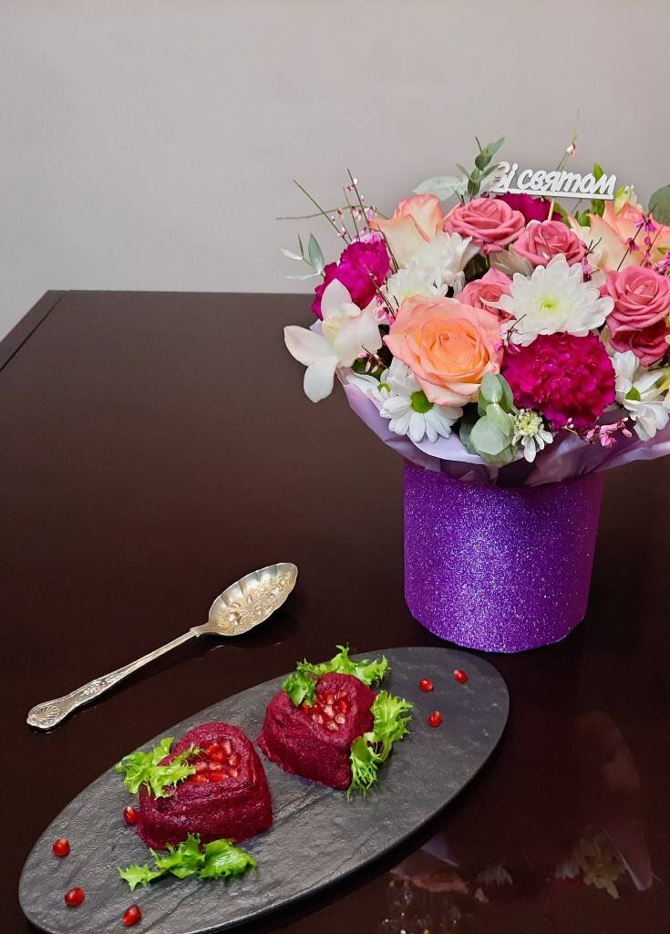 #валентинка #ігри Ингредиенты: средних свеклы, орехов, Специи , растительного масла, зерен граната Способ приготовления: Свеклу моем и помещаем в рукав. Запекаем в микроволновке 15 минут на максимальной мощности. Чистим и измельчаем. Орехи чистим и также измельчаем. Соединяем ингредиенты, добавляем специи и растительное масло. Формы для маффинов смазываем растительным маслом и накладываем пхали. Отправляем в холодильник на час. Аккуратно извлекаем из форм и украшаем гранатом.