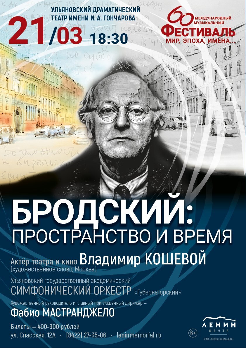21 марта в 18:30 на сцене Ульяновского драматического театра имени И.А. Гончарова (ул. Спасская, 12а) состоится премьера музыкально-поэтической композиции, посвящённой Иосифу Бродскому. В программе участвуют актёр театра и кино Владимир Кошевой (Москва) и Ульяновский государственный академический симфонический оркестр «Губернаторский». Дирижёр - художественный руководитель и главный приглашённый дирижёр Фабио Мастранджело.