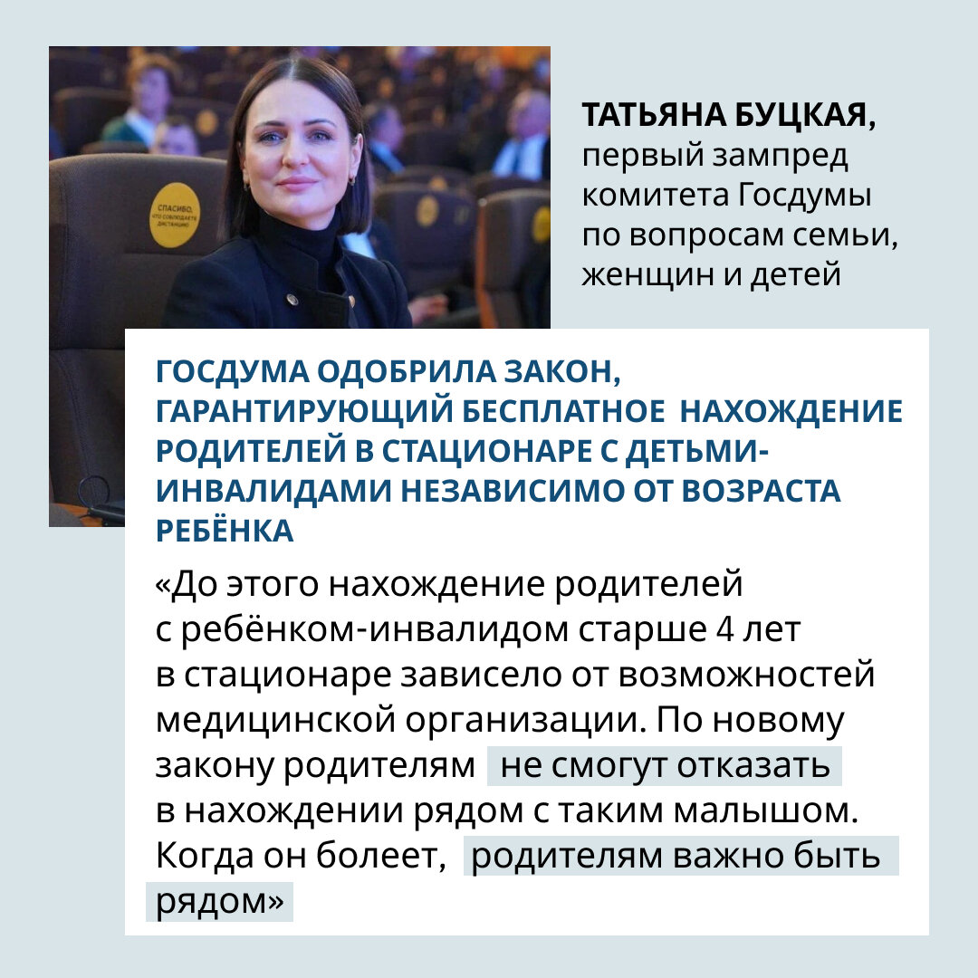 Родители детей-инвалидов получили возможность находиться вместе с ребёнком в стационаре, независимо от его возраста. Теперь это право закреплено Госдумой О важной поправке рассказала первый зампред комитета по вопросам семьи, женщин и детей Татьяна Буцкая????