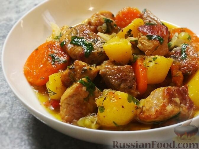 Добавить мясо, нарезанное небольшими кусочками. Обжарить до румяной корочки. Затем добавить морковь, нарезанную кружочками. Обжаривать 5 минут. Лук, нарезанный полукольцами. Обжаривать 5 минут. Болгарский перец, нарезанный дольками. Ещё 5 минут. Добавить крупно нарезанный картофель, кусочек сливочного масла, 200 мл воды, специи, сушёную петрушку и соль. Не перемешивать.