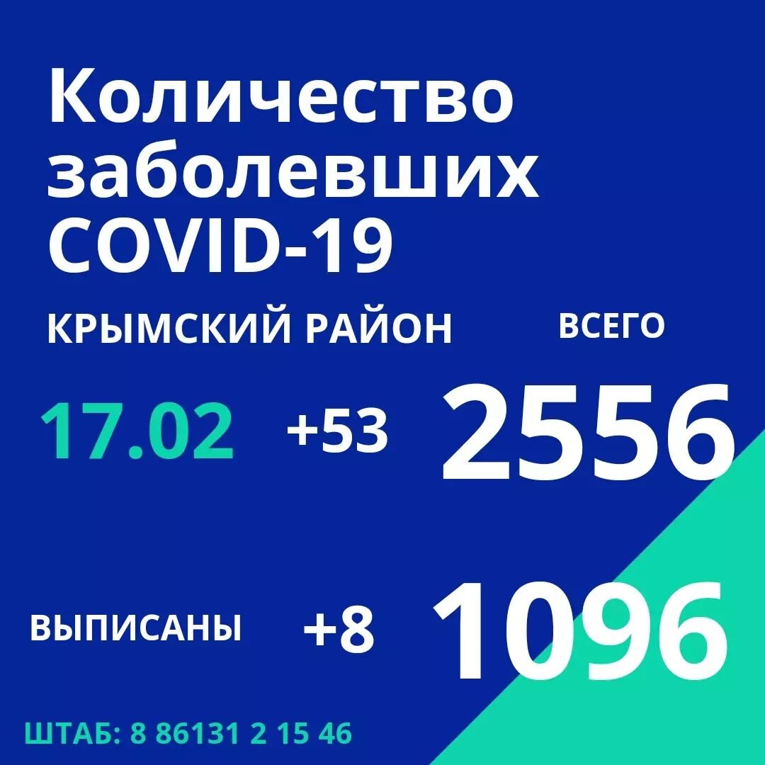 17 февраля по информации оперативного штаба Краснодарского края в Крымском районе 53 новых случая заражения коронавирусной инфекцией.⠀