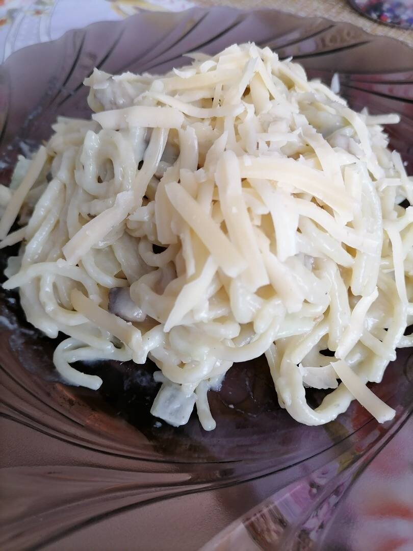 Простой вариант всеми известного блюда. Ингредиенты: спагетти, грибы шампиньоны, лук репчатый, майонез , вода , сливочное масло , масло для жарки, сухая смесь для пасты карбонара, сыр Способ приготовления: Шампиньоны очистить, вымыть. Разрезать пополам. Убрать тёмную часть и ножку. Шапочку порезать средними кубиками, а ножку полукольцами. Спагетти отварить до полуготовности. Слить воду. Приготовь смесь для заливки : в воду высыпать смесь, добавить майонез и размягчённое масло. Перемешать венчиком. Грибы пожарить на сухой сковородке при слабом огне. Добавить лук, нарезанный кубиками. Постепенно ввести спагетти. Перемешать. Влить смесь. Дождаться, когда она закипит. Затем убавить огонь и дождаться частичного испарения. Выключить плиту. Дать настояться пару минут. Сыр натереть на крупной тёрке. Посыпать сыром перед подачей. Приятного аппетита!